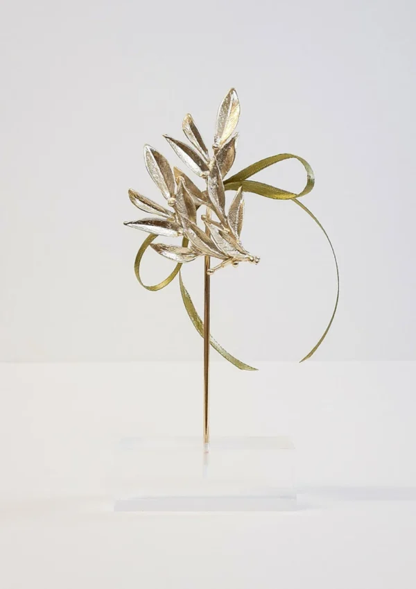 A beautiful gold plated bronze Olive twig on a perspex stand.